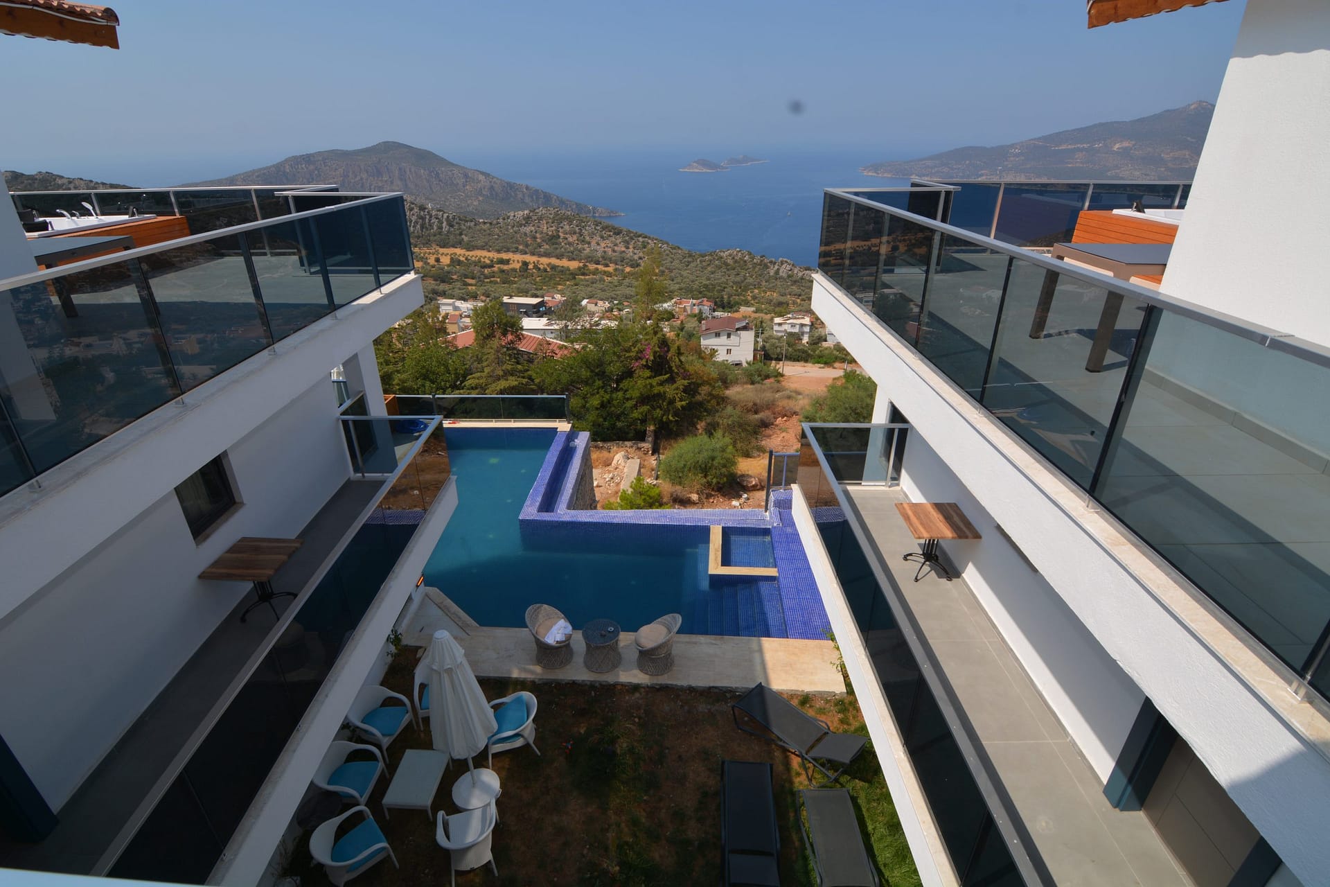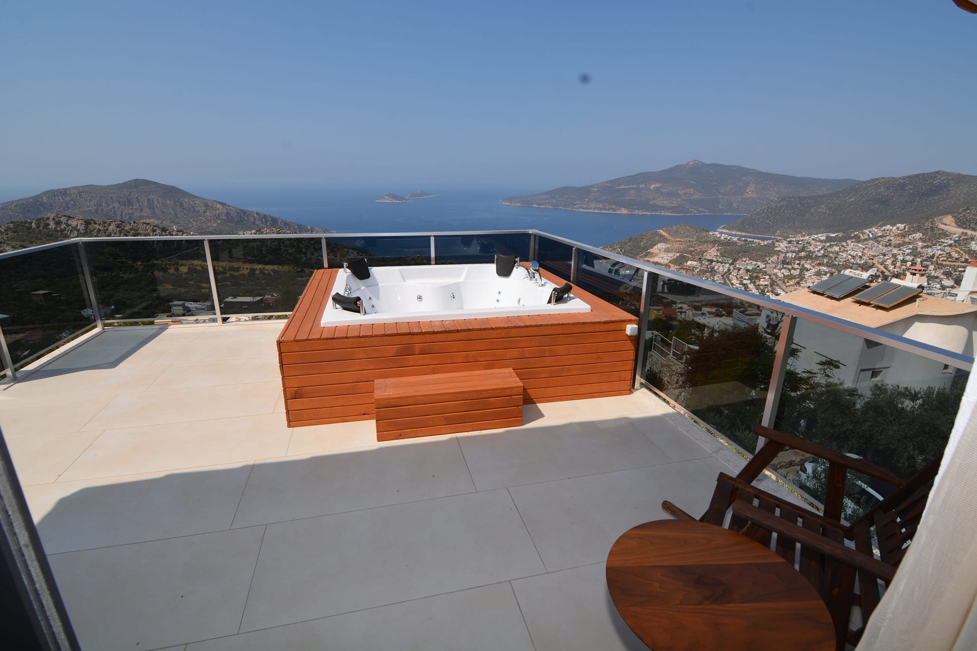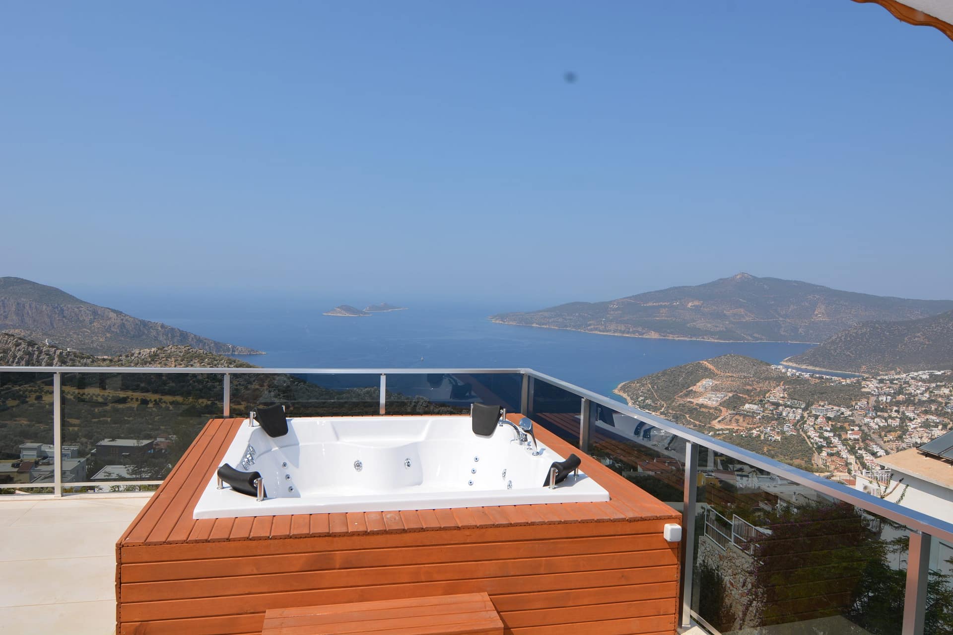 Outside is a large private roof terrace which has stunning  views over Kalkan bay and the surrounding mountains. There is a Jacuzzi bath located on the terrace.