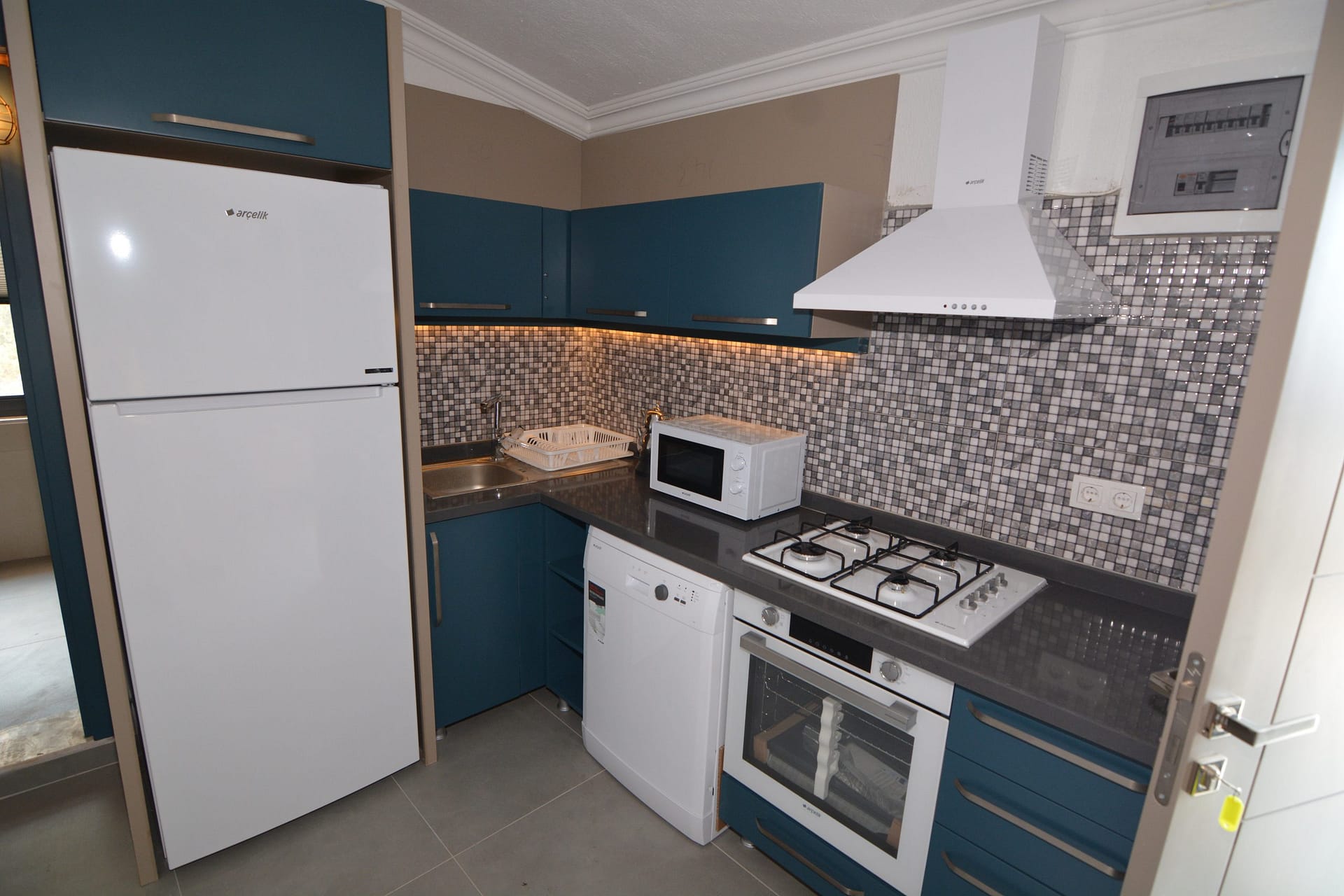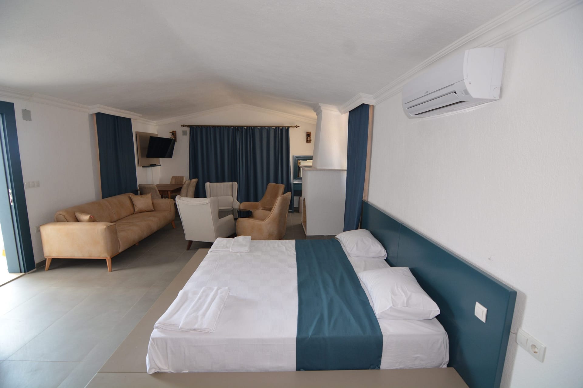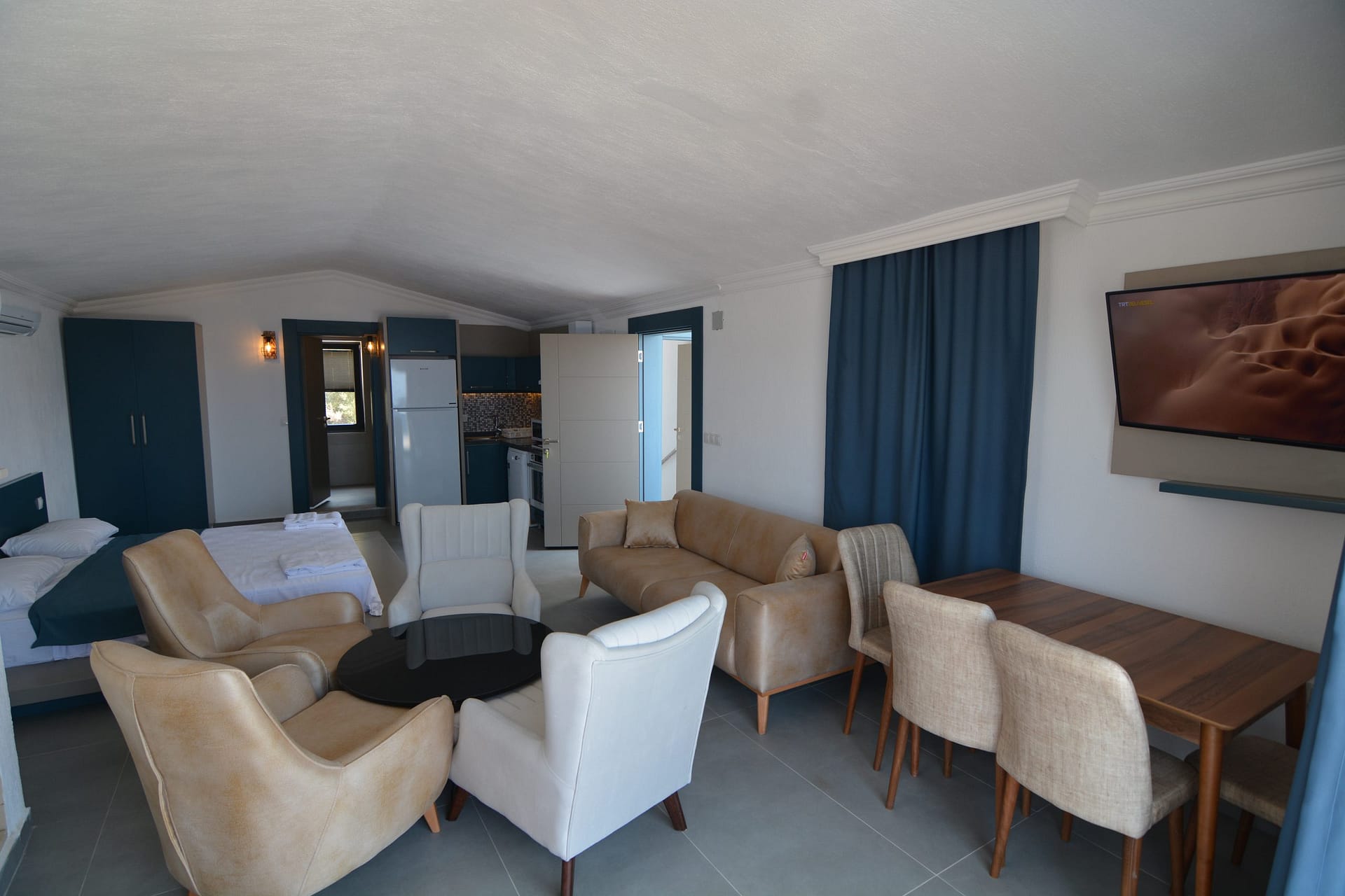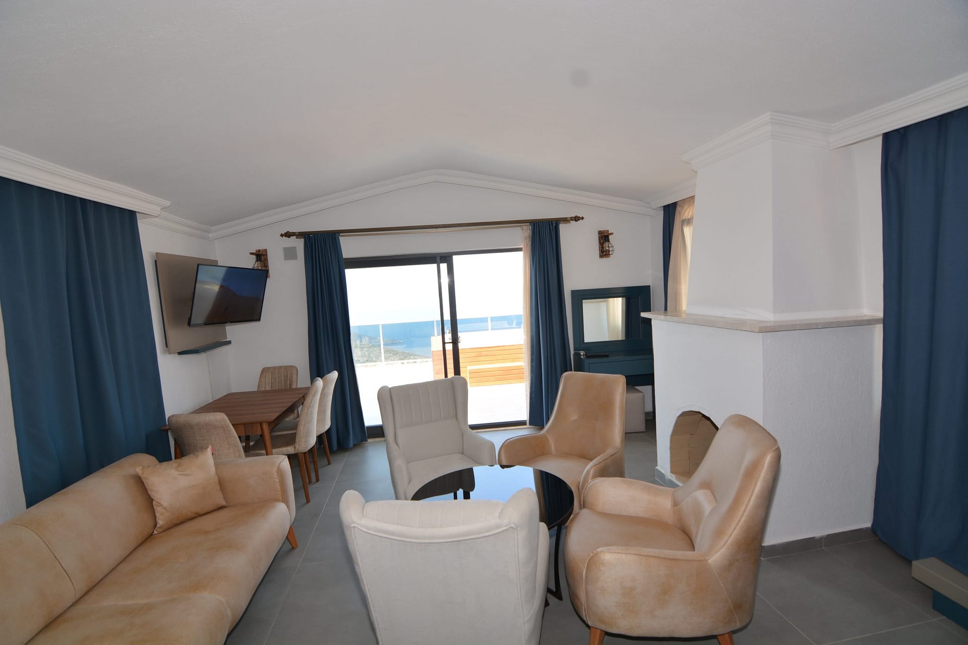 Outside is a large private roof terrace which has stunning  views over Kalkan bay and the surrounding mountains. There is a Jacuzzi bath located on the terrace.