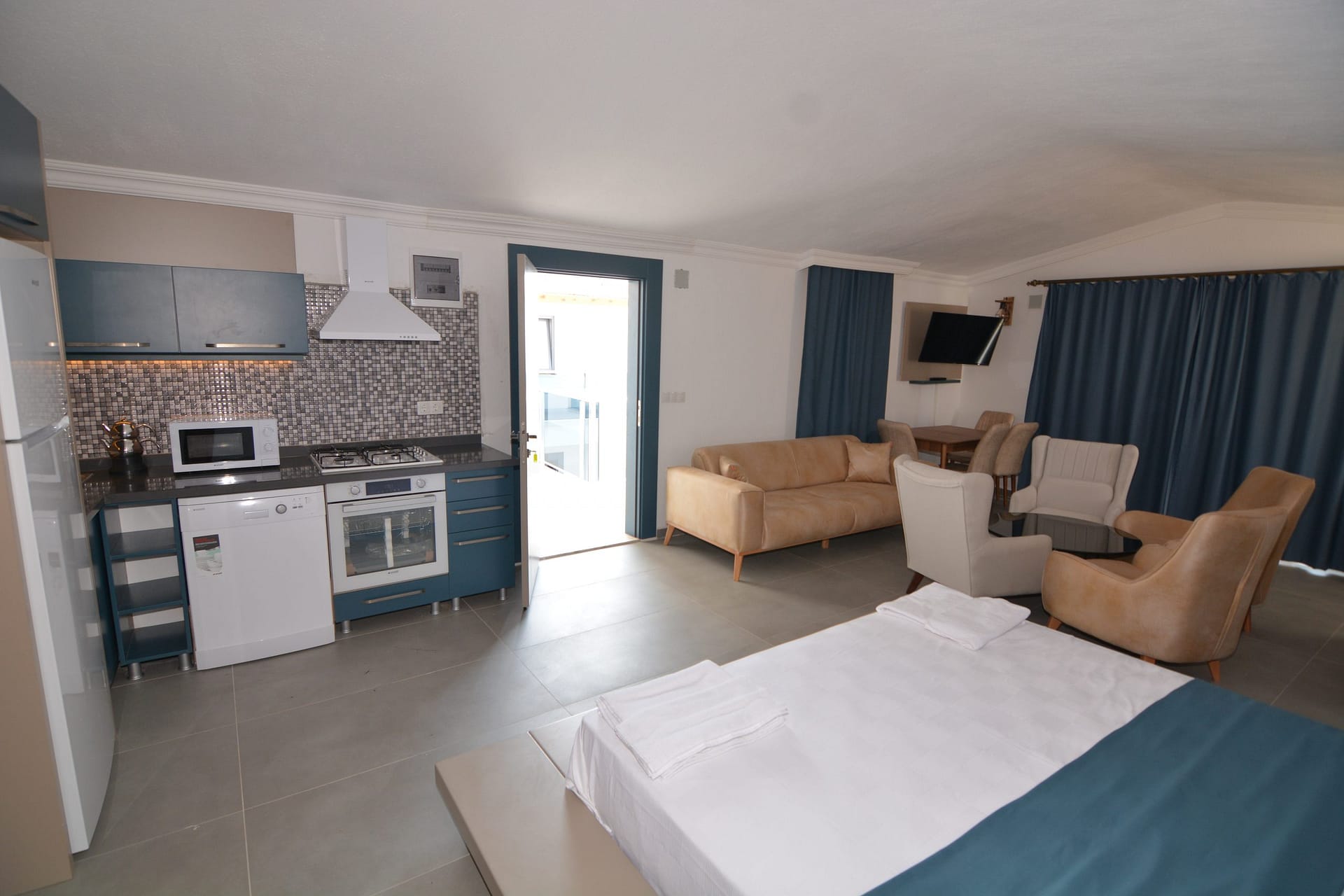 The studio apartment consists of a large open plan space which  consists of a living area, fully fitted kitchen with a full size oven and hob and a sleeping area with a double bed and ensuite bathroom.